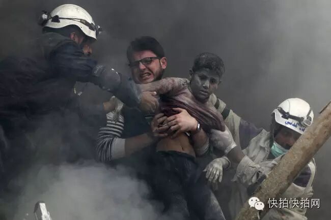 4月6日,效忠于总统阿萨德的军队在叙利亚第二大城市阿勒波投掷爆炸油桶,当地男子在爆炸中救起一名男孩。叙利亚内从2011年至今,叙利亚政府与叙利亚反对派之间的冲突已导致10万多人死亡。Hosam Katan / Reuters