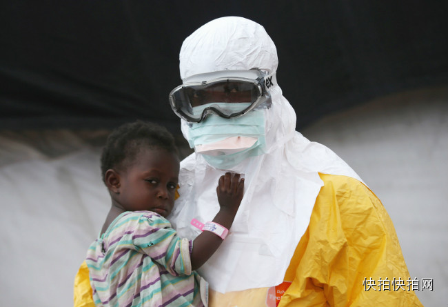 10月5日,利比里亚,佩恩斯维尔的埃博拉治疗中心,一位身着防护服的无国界医疗组织医生抱着一名疑似患有“致命病毒”埃博拉的儿童。埃博拉是本世纪爆发的最危险病毒,死亡率高达90%,至今仍没有准确的治愈医疗方案。John Moore / Getty Images