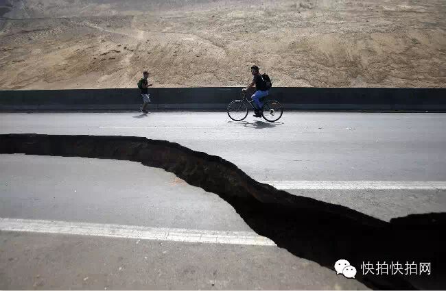 4月3日,智利,两名男子在位于伊基克和奥拓卡巴纳斯之间的高速公路上的一条巨大裂缝旁相遇。