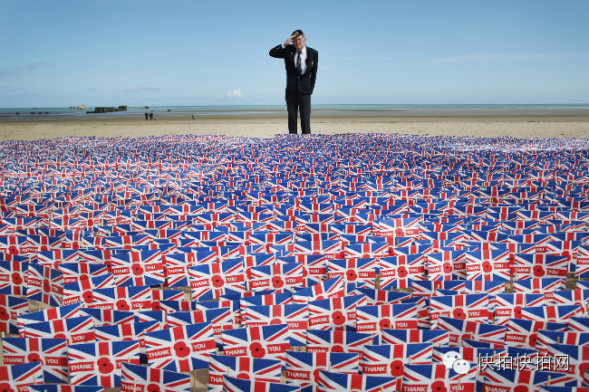 6月5日,法国阿斯内莱的海边,二战中的海军航空兵Fred Holborn在一片军团联盟旗中,向他的老战友们致敬。Peter Macdiarmid / Getty Images