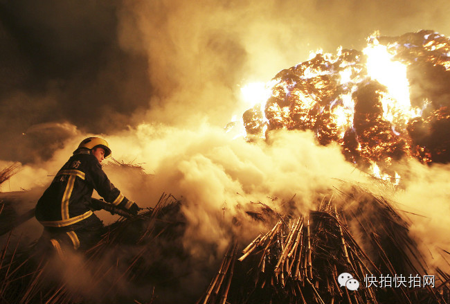 2月16日,湖南省常德,一名消防员试图扑灭造纸厂芦苇堆所起的大火。