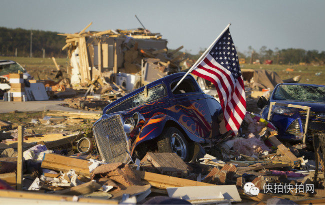 4月28日,美国阿肯萨斯州,星条旗插在一辆破车上,当地当时刚被龙卷风袭击。Carlo Allegri / Reuter