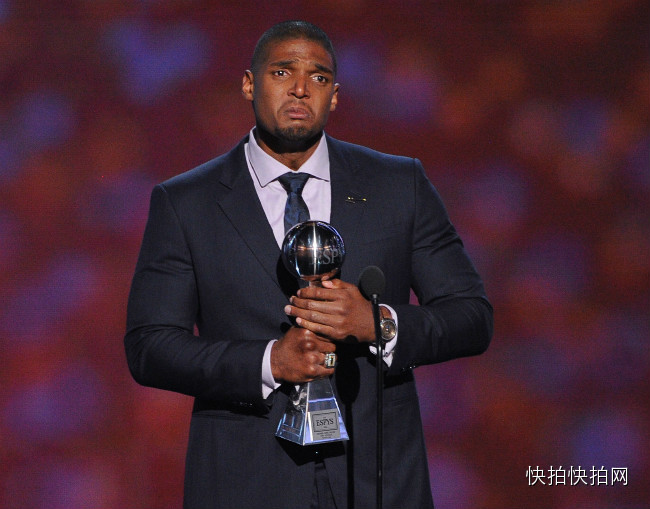 7月16日,美国第一位公开宣布自己是同性恋的橄榄球运动员Michael.Sam, 在洛杉矶接受年度最佳勇气奖的一幕。 Dilip Vishwanat / Getty Images