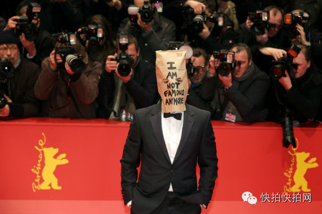 2月9日,著名演员希亚.拉博夫戴着一个纸袋改成的头套,出席在64届柏林电影节中。 JENS KALAENE/EPA
