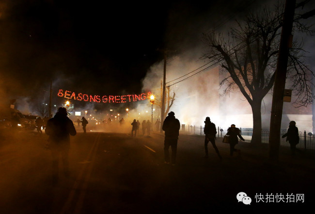 11月24日,美国弗格森,警方对示威者人群释放催泪瓦斯。这些人群在法院决定不起诉“杀人犯”达伦•威尔逊警官后聚集起来抗议。Justin Sullivan / Getty Images