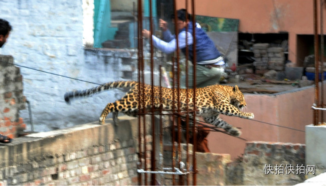 2月23日,印度米鲁特,一头豹跳过当地民居区域,一名居民急忙躲避。Stringer /AFP / Getty Images