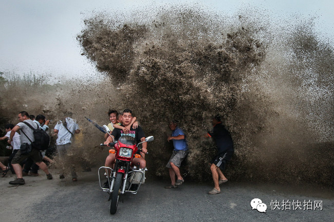 8月13日,中国杭州,钱塘江大潮冲击上岸。 摄影:陈荣辉