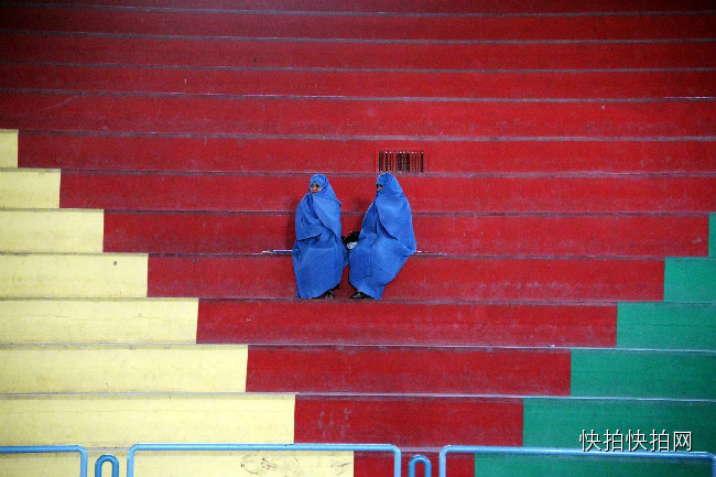 11月13日,两名阿富汗妇女在赫拉特观看女子跆拳道比赛。Aref Karimi /AFP / Getty Images