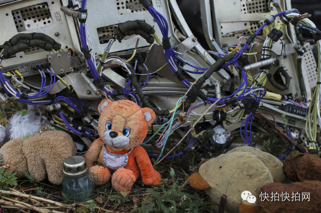 9月9日,乌克兰东部,一只泰迪熊静静坐在马航MH17的飞机残骸旁边。Marko Djurica / Reuters