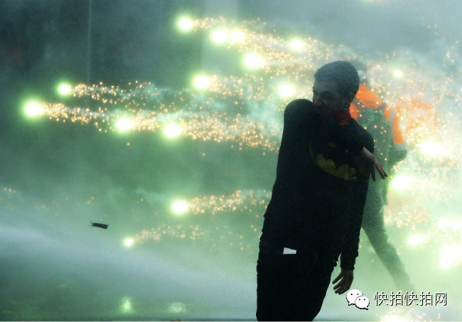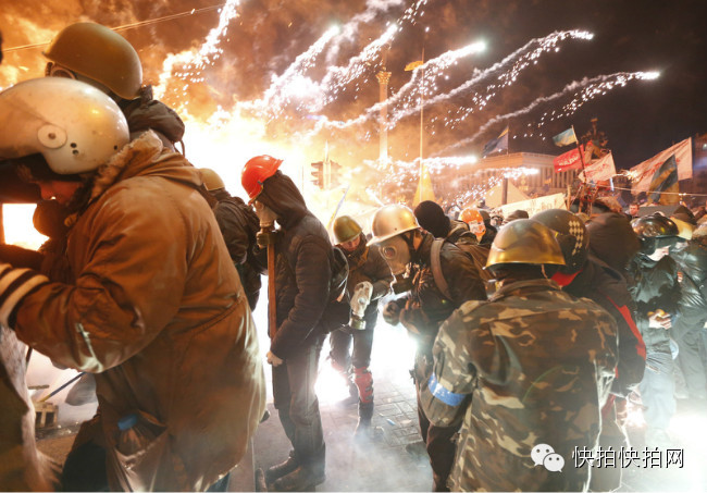 2月18日,基辅独立广场,在一场与警方的冲突中,烟火在反政府示威者身边爆炸。Vasily Fedosenko / Reuters