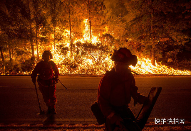 9月16日,美国加州爆发的山火中,消防员背后的火焰。Noah Berger / Reuters