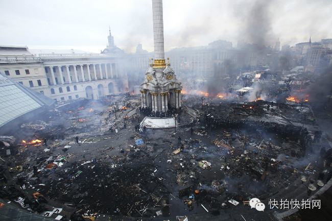 2月19日,乌克兰基辅,在反政府示威者和警方的激烈冲突后,独立广场一片焦墟。Stringer / Reuters