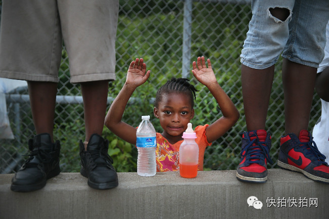 8月17日,美国弗格森,5岁的示威者Gabrielle Walker以举起双手的姿势,抗议白人警察枪杀黑人青年。Scott Olson / Getty Images