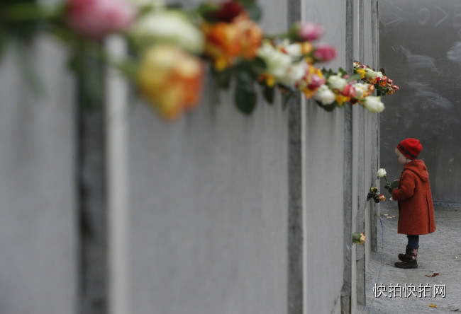 11月9日,德国柏林,一个小姑娘在柏林墙遗址外献花。今年是柏林墙推倒的25周年。Fabrizio Bensch / Reuters