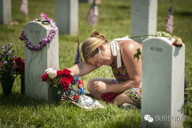 5月26日,美国弗吉尼亚州阿灵顿公墓,一名女子在丈夫的墓碑前哭泣。阿灵顿国家公墓安葬了美国国家战争中牺牲的美国军人,包括南北战争、韩战、越战以至于最近的伊拉克战争与阿富汗战争。Pete Marovich/EPA