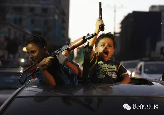 8月26日,加沙地区,两名巴勒斯坦儿童拿着枪,庆祝他们“打败”了以色列。Suhaib Salem / Reuters