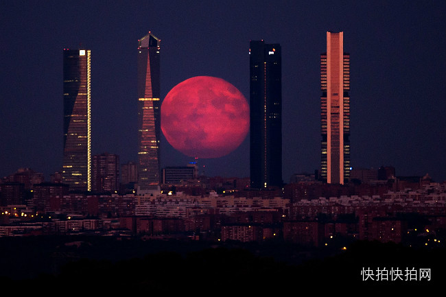 8月11日,西班牙马德里,一轮血红明月照亮了摩天大楼。