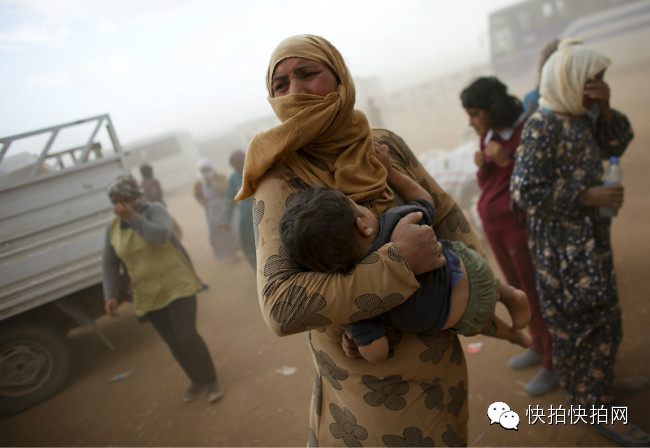 9月24日,在土耳其与叙利亚的边境小镇苏鲁奇,库尔德难民在沙尘暴中等待运输车