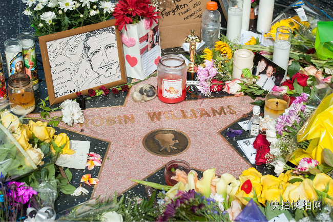 8月12日,美国加州洛杉矶,人们在著名演员罗宾威廉姆斯的星光大道星星上摆放花束,纪念这位演艺巨匠的去世。Valerie Macon / Getty Images