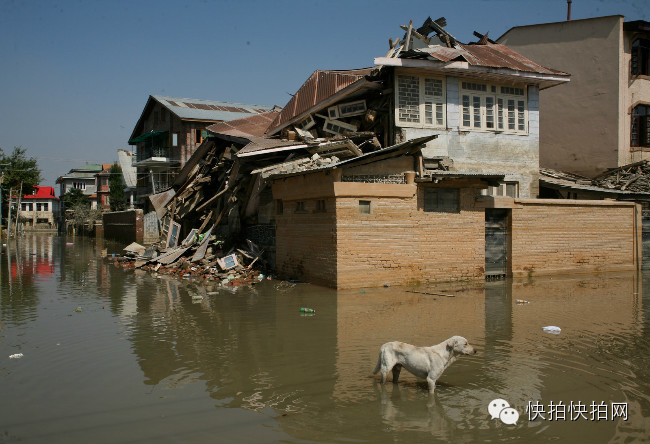 9月30日,印度的斯利那加,一条流浪狗站在被洪水摧毁的家园前。